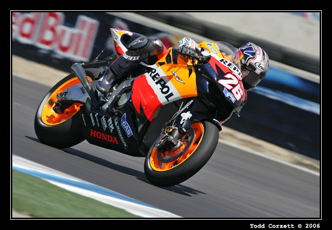 Dani Pedrosa exits turn 11 and heads down the front straight during the Saturday afternoon qualifying session for the Red Bull United States Grand Prix. Pedrosa went on to finishing behind his teammate Nicky Hayden to give Repsol Honda a one-two finish.