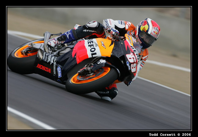 Nicky Hayden rides into turn 6 during the Sunday morning warm-up for the Red Bull United States Grand Prix. This is the only stop of the MotoGP season in North America, Hayden's only chance to ride in front of his home crowd... and like last year he went onto victory.